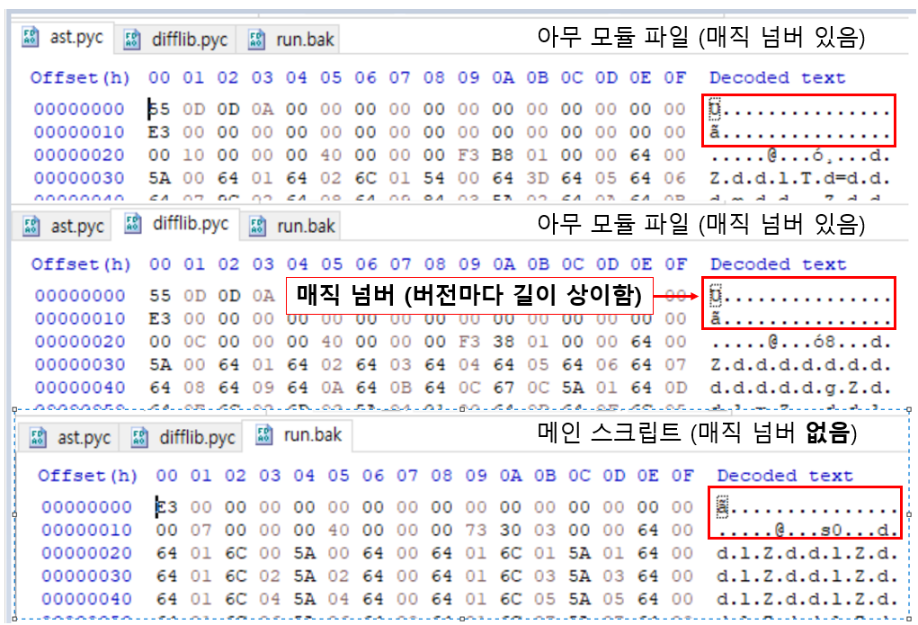 HxD로 컴파일된 아무 파이썬 모듈 파일을 두 개 가져와봤습니다. 맨 마지막 사진은 run.pyc 파일인데요. 보다시피 run.pyc 파일에는 다른 모듈에 있는 첫 한 줄이 없습니다. 저 처음 한줄이 매직 넘버입니다. 제 경우에는 55 0D 0D 0A 00 00 00 00 00 00 00 00 00 00 00 00인 거죠. 이 매직 넘버를 run.pyc의 맨 앞에 붙여줍니다.